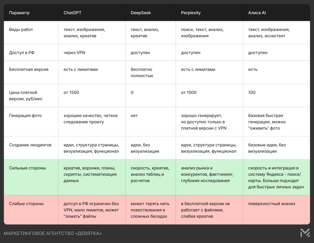 DeepSeek — быстрый и бесплатный. Хорош для расчётов, таблиц и анализа, но может терять логику в сложных обсуждениях.